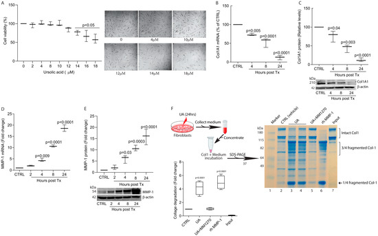 3.1. UA Suppresses Type I Collagen Expression and Stimulates MMP-1 Expression