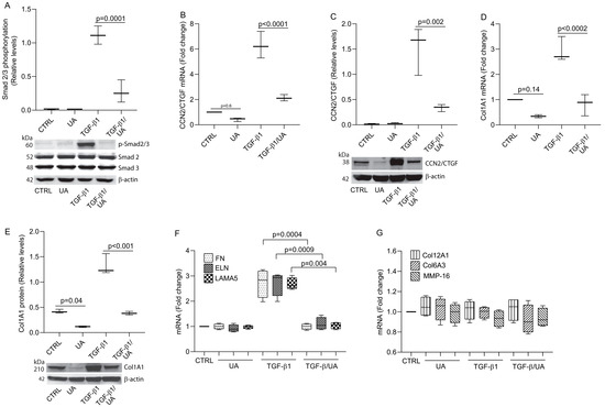 UA inhibits type I collagen expression by impairing TGF-β/Smad signaling in primary dermal fibroblasts. (A) UA inhibits TGF-β1-induced Smad2/3 phosphorylation. Cells were treated with UA (10 μM) for 4 h, followed by TGF-β1 (5 ng/mL) for one hour. Smad2/3 phosphorylation was assessed by Western blot. (B–E) Cells were treated with UA (10 μM) and TGF-β1 (5 ng/mL) for 24 h. UA inhibits TGF-β1-induced expression of (B) CCN2/CTGF mRNA, (C) CCN2/CTGF protein, (D) Col1A1 mRNA, (E) Col1A1 protein, and (F) FN, ELN, and LAMA5 mRNA. (G) Non-TGF-β target genes remain unaffected by UA treatment. mRNA levels were quantified by real-time RT-PCR and normalized to 36B4 mRNA (internal control). Protein levels were determined by Western blot analysis and normalized to β-actin (loading control). Data are expressed as mean ± SEM (N = 3). p-values are indicated in the respective graphs. Original western blots can be found at Supplementary Materials.