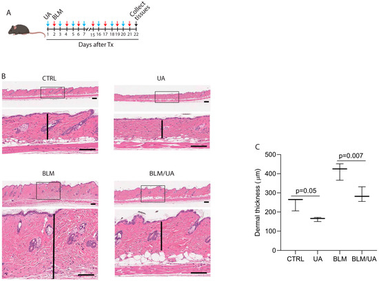 UA inhibits skin thickness in bleomycin-induced mouse model of fibrosis. (A) Experimental design: C57BL/6J mice were intradermally treated with bleomycin (100 μL, 1 mg/mL) subcutaneously every other day and UA (100 μL, 20 μM) topically on alternate days for three weeks. (B) UA treatment reduces bleomycin-induced dermal thickening. Representative H&E staining of back skin. Control mice were treated with the solvent ethanol. Scale bars = 100 μm. N = 5 in each group. (C) Dermal thickness was quantified using ImageScope (version 12.4.6, Leica, Deer Park, IL, USA). N = 5 in each group. Data are expressed as mean ± SEM (N = 5 in each group). p-values are shown in the respective graphs.