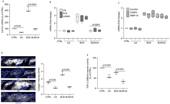 The above data raised the question of whether UA could reduce bleomycin-induced collagen production and accumulation in the dermis of mouse skin. To explore this, we first determined Col1A1 mRNA expression. We found that while bleomycin treatment robustly induced Col1A1 expression, co-treatment with UA significantly attenuated this response (Figure 5A). In addition to Col1A1, UA significantly inhibited other TGF-β target genes, FN, ELN, and LAMA5 mRNA expression, without affecting basal expression (Figure 5B). Furthermore, non-TGF-β target genes such as Col12A1, Col6A3, and MMP-16, remain unaffected by UA treatment (Figure 5C), suggesting the specificity of UA effects on a subset of TGF-β-regulated genes. Next, we assessed dermal collagen fiber density using two-photon microscopy. While bleomycin significantly increased collagen fiber density (Figure 5D, third panel from the top and bar graph), UA treatment markedly reduced bleomycin-induced dermal collagen accumulation (Figure 5D, bottom panel and bar graph). Additionally, topical UA alone decreased skin dermal collagen fiber density in untreated control mice (Figure 5D, second panel from top and bar graph). We extended our in vitro findings that UA could inhibit bleomycin-induced collagen production by the impairment of TGF-β/Smad signaling (Figure 2). To test this possibility, we conducted a well-established SBE 4x (tandem repeats of Smad Biding Element) reporter assay, which utilizes tandem repeats of the Smad Binding Element (SBE) as a highly sensitive tool to assess TGF-β-induced Smad transcriptional activity [30]. Our results confirmed that UA treatment significantly reduced SBE 4x reporter activity in either UA alone or bleomycin-treated skin (Figure 5E). These findings suggest that UA may inhibit bleomycin-induced collagen production and accumulation by suppressing TGF-β/Smad signaling.