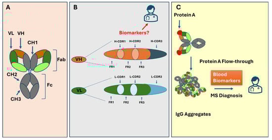 Graphic overview depicting the antibody structure, the arrangement of CDRs and their framework in heavy and light chains, and the binding of Protein A, resulting in the enrichment of IgG aggregates. (A) An antibody is composed of a heavy and light chain with Fab and Fc fragments. (B) CDR1-CDR3 and the framework segments in heavy and light chains. (C) The binding of Protein A resulted in the enrichment of IgG aggregates, which can be used as MS biomarkers.