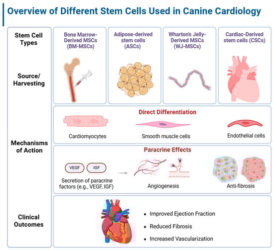 Overview of different stem cell sources used in canine cardiology, highlighting general therapeutic effects and mechanisms of action.