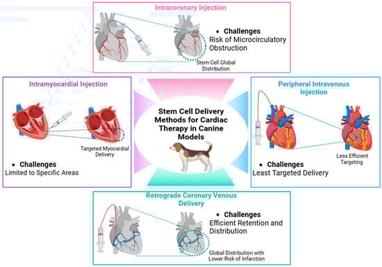 Direct coronary arterial infusion allows for global distribution, but it carries the risk of microcirculatory obstruction, which could lead to embolic myocardial damage [90,109,110]. In a study by Vulliet et al. (2004), the safety of intra-coronary injection of mesenchymal stromal cells (MSCs) was assessed in healthy dogs. After injecting autologous MSCs into the left circumflex coronary artery, acute myocardial ischemia was observed, characterized by ST segment elevation and T wave changes. Seven days later, myocardial infarction and areas of fibroplasia and macrophage infiltration were noted. Elevated cardiac troponin I levels and collagen deposition were also detected [111].