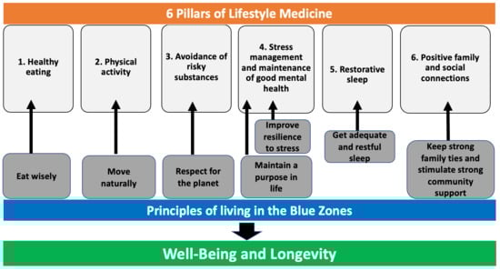 - Kreouzi, M.; Theodorakis, N.; Constantinou, C. Lessons Learned from Blue Zones, Lifestyle Medicine Pillars, and Beyond: An Update on the Contributions of Behavior and Genetics to Wellbeing and Longevity. Am. J. Lifestyle Med. 2022, 18, 750–765. [Google Scholar] [CrossRef]