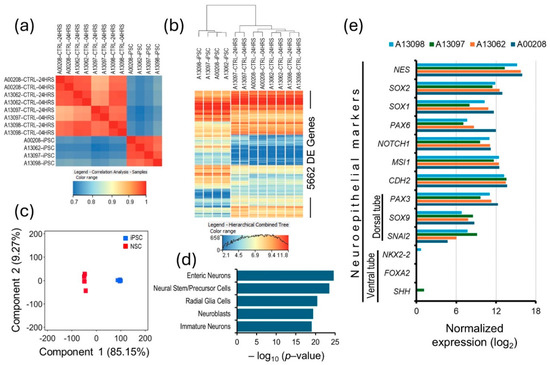 Characterization and quality control of generated NSCs. (a) A correlation coefficient (r2) plot based on the iPSCs and their differentiated NSCs’ expressed transcriptomes (16021 genes with NRC ≥ 10 in iPSCs and/or differentiated NSCs). (b) Heat map of transcriptome-wide differentially expressed genes between iPSCs and their differentiated NSCs. (c) Principal components plot based on the iPSCs’ and NSCs’ DE transcriptomes. (d) Cell type gene set (PanglaoDB Augmented 2021) enrichment of the NSCs’ upregulated transcriptome. (e) A bar plot of the neuroepithelial marker gene expression in the generated NSCs.