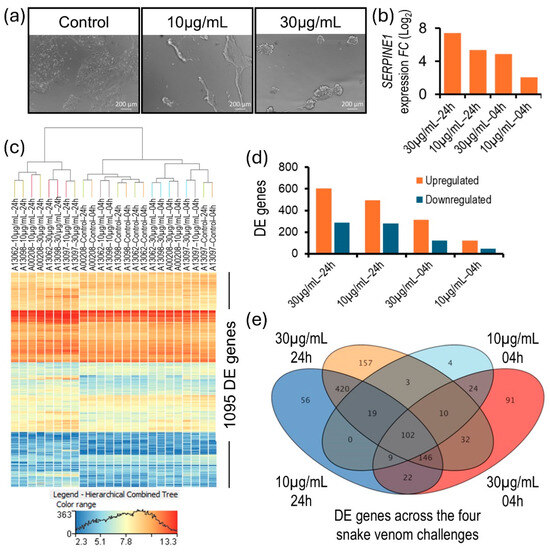 The first visible sign of the snake venom challenge on NSC culture was that it digested the basement matrix within an hour and the cells self-organized into 3D suspension structures. Also, the expression of the gene serpin family E member 1 (SERPINE1), which encodes a member of the serine proteinase inhibitor superfamily, was among the top upregulated genes (Figure 2a,b). These results suggest a potent protease component in the Mojave Type A rattlesnake venom that causes tissue injury and plausibly accelerates the spread of venom toxins. To investigate the transcriptome-wide neurocellular cellular response to Mojave Type A snake venom, 15,654 genes with an NRC ≥ 10 in at least one of six conditions of the snake venom challenge (i.e., vehicle-treated control and 10 µg/mL and 30 µg/mL snake venom-challenged, both at 4 and 24 h time points, respectively) were considered expressed and included in the genome-wide differential gene expression analysis. A pairwise differential gene expression analysis between vehicle-treated controls and 10 µg/mL and 30 µg/mL Mojave Type A rattlesnake venom-challenged NSCs at time points of 4 and 24 h identified 1095 genes that were significantly (one-way ANOVA p-value ≤ 0.05; FC abs ≥ 1.5) DE (Table S1 and Figure 2c). While time showed an augmenting effect, a higher dose of snake venom (30 µg/mL) accelerated the neurocellular response. The 30 µg/mL snake venom challenge for 24 h resulted in the most with 889 DE genes and higher cell death, followed by 774 DE genes in the 10 µg/mL venom challenge for 24 h, 436 DE genes in the 30 µg/mL venom challenge for 4 h, and 171 DE genes in the 10 µg/mL venom challenge for 4 h (Figure 2d,e).
