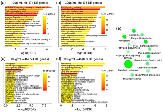 DE gene sets enrichment in KEGG pathways. (a–d) Top 20 enriched KEGG pathways in genes that were DE post–10 µg/mL for 4 h, –30 µg/mL for 4 h, –10 µg/mL for 24 h, and –30 µg/mL for 24 h Mojave Type A rattlesnake venom challenges, respectively. (e) Network of top 20 KEGG pathways that were enriched in 633 DE genes, which were specific to the NSC’s response to the longer 24-h venom challenge. Two pathways (nodes) are connected if they share 20% or more genes. Darker nodes are more significantly enriched gene sets. Bigger nodes represent larger gene sets. Thicker edges represent more overlapped genes.