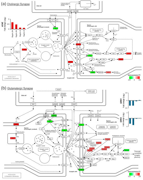 Mojave Type A rattlesnake venom-induced expression change in excitatory synapse genes. (a) KEGG Cholinergic synapse map showing upregulated ACHE expression in venom-challenged NSCs. (b) KEGG Glutamatergic synapse map showing altered expression of ionotropic and metabotropic glutamate receptors in venom-challenged NSCs.