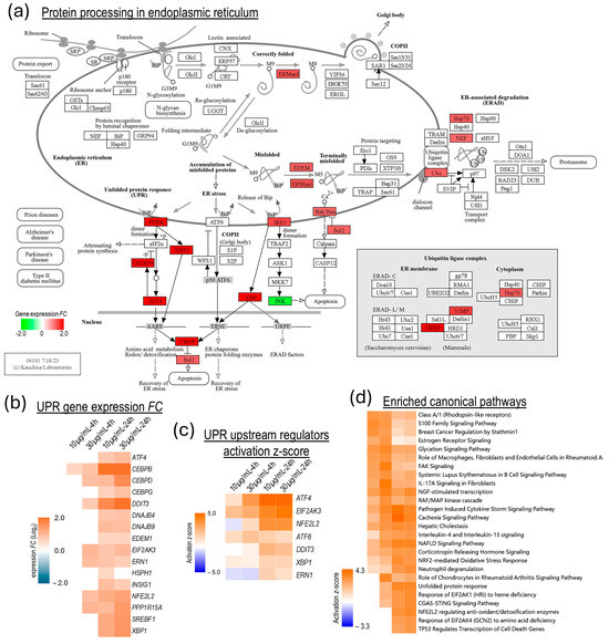 Unfolded protein response in venom-challenged NSCs. (a) KEGG pathway map of protein processing in ER showing upregulated UPR-associated genes. (b) Expression heat map of UPR-associated genes across the venom challenge conditions. (c) Activation z-score heat map of key UPR-associated transcription factors. (d) Heat map of significantly enriched and highly activated (activation z-score ≥ 3.0) IPA canonical pathways.