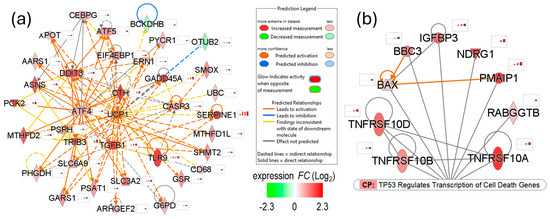 Mojave Type A rattlesnake venom-induced mitochondrial toxicity in NSCs. (a) Gene network showing predicted upregulation of UCP1, suggesting mitochondrial energy decoupling. (b) Network of TP53-regulated cell death genes indicating mitochondrial membrane permeabilization and upregulation of both intrinsic and extrinsic programmed cell death in venom-challenged NSCs.