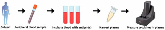 Workflow for a whole-blood assay to measure cytokine production in response to antigen stimulation. Peripheral blood samples are collected from the subject and incubated with specific antigens. After incubation, plasma is harvested, and cytokine levels in the plasma are measured using a highly sensitive platform, such as the V-plex system from Mesoscale Discovery (MSD), which can measure sub-pg/mL concentrations of IL-2.