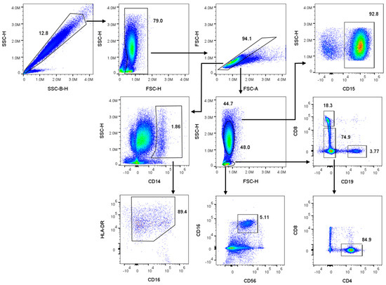 Gating strategy for identification of blood leukocyte populations based on cell-specific CD marker expression.