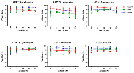 Viability of leukocyte populations after transfection using different transfection reagents. Whole-blood cells were transfected with increasing concentrations of mock miRNA sequence (c.el-239b) and one of the three transfection reagents (LipoRM, HiPe, and Dhar4). Percentage of viable cells was determined. No miRNA (0 nM) refers to untransfected samples. Values are presented as mean ± standard deviation (SD); n = 3.