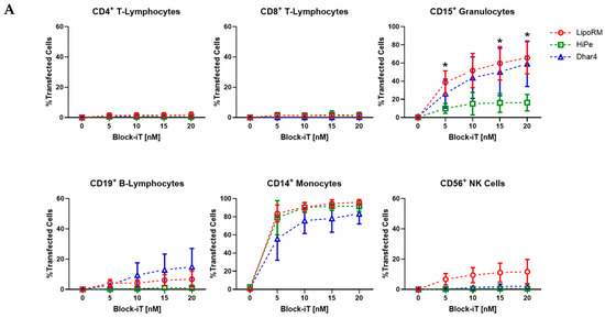 Transfection efficiency is a critical parameter for the success of any transfection experiment. Primary cells are generally considered to be hard-to-transfect cells due to their sensitivity and lower proliferative capacity compared to immortalized cell lines [36,37]. Therefore, different approaches and modifications to transfection methods have been developed to enhance efficiency in nucleic acid delivery. Engineering nanoparticles or using nucleofection are some examples that have proven to be potential solutions [36,38]. In this study, we aimed to develop a chemical transfection method ex vivo. Whole blood was treated with any of the three selected reagents and a fluorescent-labeled miRNA, which served as a traceable marker at a single-cell resolution. Our results revealed that phagocytes, CD15+ granulocytes, and CD14+ monocytes took up and expressed the labeled miRNA. This observation is consistent with reports proposing that endocytosis and phagocytosis participate in the uptake of the positively charged lipid–nucleic acid complexes [3,39]. Interestingly, the transfection efficiency of CD14+ monocytes exceeded 80% despite isolated primary cells generally being considered difficult to transfect [40,41]. This raises the question of whether isolation procedures influence the sensitivity of these cells to transfection. Primary monocyte isolation is typically carried out by density gradient centrifugation followed by anti-CD14 magnetic bead selection. This procedure consists of multiple isolation and washing steps that lead to different molecular characteristics and immunophenotypic behavior and, therefore, potentially influences the ability to absorb lipoplexes [42,43]. On the other hand, incubation in whole blood may enhance the efficiency of chemical transfection methods. The physiological environment may benefit leukocytes and positively affect their ability to take up loaded lipid complexes. To assess potential donor-dependent variation, we calculated the average standard deviation by first determining the standard deviation for each concentration and then computing the mean of these values across all tested concentrations. We observed a trend to larger variations in transfection efficiency for Dhar4 (average standard deviation 13.1% ± 3.7%), followed by HiPe (average standard deviation 7.1% ± 4.8%) and LipoRM (average standard deviation 4.4% ± 1.9%). Although statistical analysis revealed no significant differences between the three reagents, it should be noted that the sample size in our study is small, and as such, not all potential outcomes are accounted for. Therefore, donor-dependent variation always remains a possibility. The second substantially transfected leukocyte population was CD15+ granulocytes. LipoRM and Dhar4 demonstrated transfection efficiencies of up to 66% and 59%, respectively. HiPe, on the other hand, was ineffective for delivery into granulocytes. Considering the short lifespan and high susceptibility to activation of isolated granulocytes [44], the observed transfection efficiency ex vivo presents a promising approach for RNAi experiments, e.g., in neutrophils. Typically, transfection experiments in neutrophils are conducted using nucleofection, which provides acceptable transfection efficiency. However, performing transient knockdown experiments is limited due to poor survival [45]. Keeping granulocytes under ex vivo conditions may be beneficial regarding their survival and outcome of RNAi-based transfection studies. The question arises as to why we observed slightly reduced efficiency with Dhar4 in monocytes and significantly reduced efficiency with HiPe in granulocytes. Potential answers to this question could provide the composition of the three reagents, but due to the proprietary nature of their formulation, a proper interpretation is challenging. Furthermore, up to 20% of CD19+ B-lymphocytes and CD56+ NK cells demonstrated expression of Alexa Fluor 555 after transfection with Dhar4 and LipoRM, respectively. Lymphocytes are generally regarded as challenging to transfect and show lower transfection efficiencies when using lipid-based reagents. For instance, in vitro transfection of NK92 cells, an immortalized NK cell line, using LipoRM resulted in low transfection efficiency and minimal gene silencing [46]. While both populations showed uptake of the lipoplexes, it remains to be evaluated whether this uptake has functional significance.