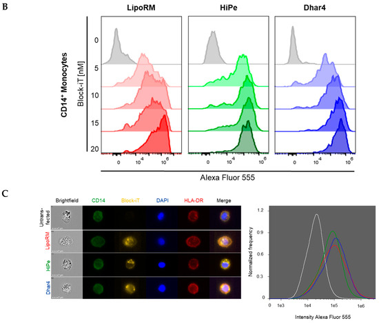 Transfection efficiency in leukocyte populations after using increasing concentrations of Alexa Fluor 555-labeled miRNA (Block-iT) and different transfection reagents. (A) Percentage of Alexa Fluor 555 positive cells 72 h post-transfection using LipoRM, HiPe, or Dhar4. Values for no miRNA (0 nM) refer to untransfected cells. Values are presented as mean ± standard deviation (SD); n = 3. Multiple t-test; statistical differences in transfection efficiency are depicted with * for LipoRM vs. HiPe, * p < 0.05. (B) Representative histograms with increasing Alexa Fluor 555 intensity as indicator for positive transfected CD14+ monocytes. (C) 60× Representative images and intensity histogram of primary CD14+ monocytes treated with 20 nM Block-iT and different transfection reagents LipoRM (red), HiPe (green), or Dhar4 (blue) acquired by imaging flow cytometry.