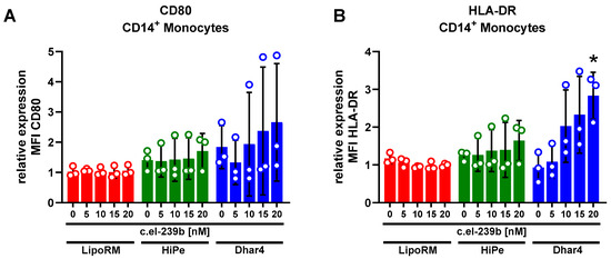 Immune activation of monocytes assessed via HLA-DR and CD80 expression after transfection with LipoRM, HiPe, or Dhar4. (A) Median fluorescence intensity (MFI) of CD80 expression after transfection with mock miRNA sequence (c.el-239b) normalized to untransfected monocytes. (B) MFI of HLA-DR expression after transfection with mock miRNA sequence (c.el-239b) normalized to untransfected monocytes. Values for no miRNA (0 nM) refer to cells treated with transfection reagent only. Values are presented as mean ± standard deviation (SD); one sample t-test * p < 0.05 compared to untransfected cells; n = 3.