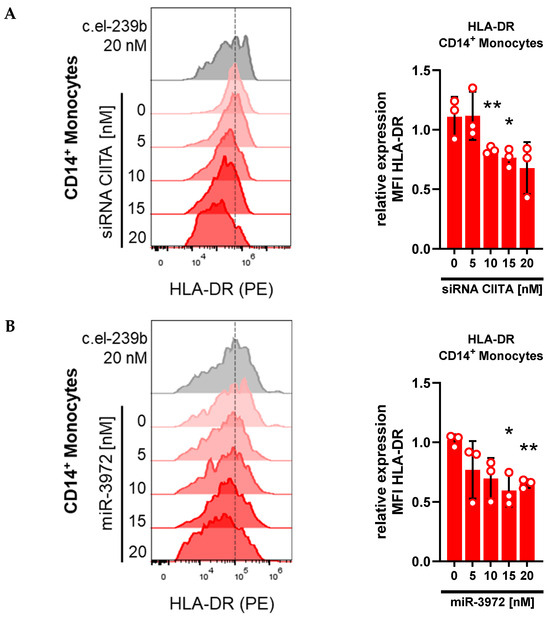 Dose-dependent HLA-DR downregulation in monocytes upon treatment with siRNA and miRNA. (A) Median fluorescence intensity (MFI) of HLA-DR expression 72 h after transfection with increasing concentration of siRNA CIITA and LipoRM. Bar plot normalized to mock transfected cells (c.el-239b). (B) Median fluorescence intensity (MFI) of HLA-DR expression 72 h after transfection with increasing concentration of miR-3972 and LipoRM. Bar plot normalized to mock transfected cells (c.el-239b). Values for no miRNA (0 nM) refer to untransfected cells. One sample t-test * p < 0.05; ** p < 0.01 compared to mock transfected cells. Values are presented as mean ± standard deviation (SD); n = 3.