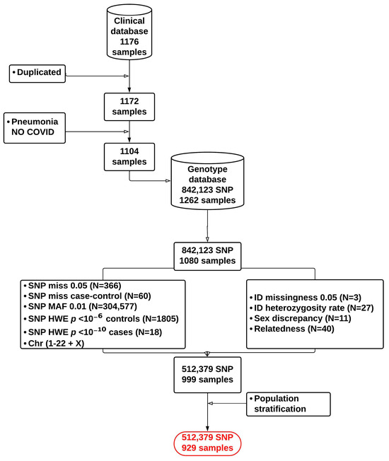 Flow chart showing quality control steps implemented in the GWAS of COVID-19 severity.