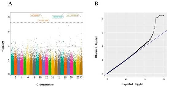 GWAS results for comparison of variant allele frequencies in ICU- and non-ICU-based hospitalized COVID-19 patients. (A) Manhattan plot for severity of COVID-19 disease. The horizontal black dotted line is drawn at GWAS significance threshold level (p < 5 × 10−8), and the grey dotted line corresponds to the suggestive threshold of p < 10 −4. Each dot represents a single SNP, and the contrasting colors of each block show the extent of each chromosome. (B) Q–Q plot of GWAS results. Expected p-value is represented with a blue line and observed p-value with a black line.