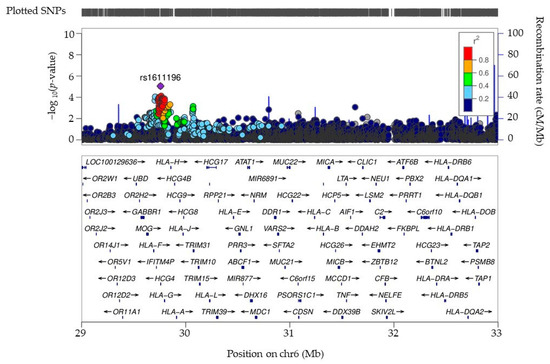 Eighty-seven additional variants were associated with severity with suggestive levels of significance (10−8 < p < 10−4). These include variants at previously reported loci such as 16q23.1 (WWOX [25]) and 6p22.1 (HLA-G [26]) (full variant information in Table S2). The ideogram image in Figure 3 shows the chromosomal locations of all suggestive and genome-wide variants. Among the suggestive variants, we observed nine loci with at least two associated markers (Table 3). LINC01139, CYP1A2 and CPLX3 have been identified in the BioGRID COVID-19 Coronavirus Curation Project (https://thebiogrid.org, accessed on 30 November 2024). CYP1A2 variants have also been previously identified as associated with severity in COVID-19 disease [27]. The HLA-G gene contained 10 associated variants, all of which were in LD (lead variant rs1611196). These variants are also in LD with rs1610696, which was reported, similarly to our results, to have a protective association with COVID-19 severity (Table S2) [26]. A regional association plot of the HLA region, showing a peak of association at the HLA-G locus, is presented in Figure 4. Of the 72 distinct loci marked by the SNPs from our GWAS with p < 10−4, twenty-one have been associated with COVID-19 previously (Table S2). MAGMA pathway analysis revealed galactosyltransferase activity as significantly associated with COVID-19 severity (beta = 0.67; p = 2 × 10−4). This activity has been reported to facilitate the assembly and secretion of the SARS-CoV-2 virus within the host [28]. Additional relevant findings of this analysis highlight the pancreas (beta = 0.017; p-value = 0.03) and pituitary gland (beta = 0.014; p = 0.07), both of which have been related with COVID-19 severity before [29,30].