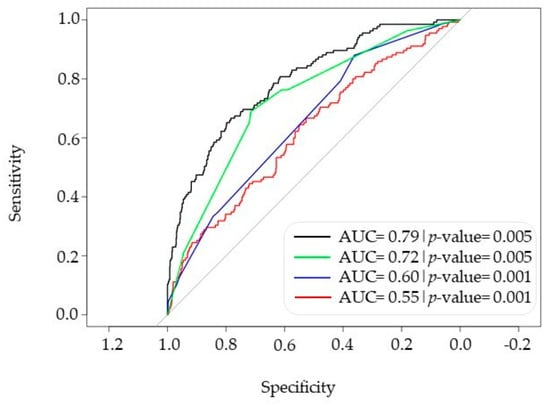- Robin, X.; Turck, N.; Hainard, A.; Tiberti, N.; Lisacek, F.; Sanchez, J.; Müller, M. pROC: An open-source package for R and S to analyze and compare ROC curves. BMC Bioinform. 2011, 12, 77. [Google Scholar] [CrossRef] [PubMed]