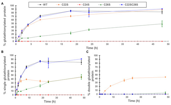 Relative protein glutathionylation as measured by whole-protein mass spectrometry for the γS-crystallin and the four cysteine variants. Each point represents the average of three replicates for each protein variant at different timepoints, the error bars represent the S.D. of the replicates. (A) Overall protein glutathionylation of γS-crystallin (WT, black dots) and the cysteine variants (C22S, orange squares; C24S, red diamonds; C26S, green triangles and C22SC26S, blue x-marks). The overall glutathionylation accounts for the relative amount of protein covalently linked to one (B) and two (C) glutathionyl moieties.