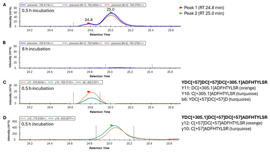 Identification of the 20-YDCDCDCADFHTYLSR-35 peptide with one glutathionylation (+305.1 Da) and two alkylations (+57 Da) in γS-crystallin incubated with GSSG. (A) Mass chromatogram of precursor ions eluting in two peaks after 0.5 h incubation and (B) no precursor peaks after 8 h incubation with GSSG. (C) Fragment ions of the 20–35 peptide containing a glutathionylation at C26 and alkylation at C22 and C24 are associated with precursor Peak 1 eluting at 24.8 min. The y11 and y10 ions correspond with glutathionylation of C26 while the b6 ion corresponds to alkylation of C22 and C24. (D) Fragment ions of the 20–35 peptide containing a glutathionylation at C22 and alkylation at C24 and C26 are associated with the precursor Peak 2 eluting at 25.0 min. The y12 ion corresponds with alkylation of C24 and C26 and the y10 ions corresponds with alkylation of C26. The mass of the precursor peptide is for the 3+ charge state (+++).