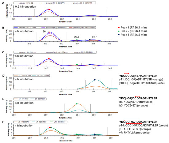 Identification of the 20-YDCDCDCADFHTYLSR-35 peptide with one alkylation (+57 Da) and one disulfide in γS-crystallin during incubation with oxidized glutathione. (A) Mass chromatogram of precursor ions after 0.5 h, (B) 4 h, and (C) 8 h in GSSG. (D) Fragment ions of the 20–35 peptide after a 4 h incubation with GSSG containing a disulfide between C22 and C24 and alkylation at C26. y11 and y10 ions, associated with precursor Peak 3, correspond with alkylation of C26. (E) Fragment ions of the 20–35 peptide after 4 h incubation with GSSG containing a disulfide between C24 and C26 and an alkylation at C22. b4 and b3 ions, associated with precursor peak 2, correspond with alkylation of C22. (F) Fragment ions of the 20–35 peptide after 4 h incubation with GSSG containing a presumed disulfide between C22 and C26 and an alkylation at C24. Fragments are non-specific to this species, but y14 confirms presence of one alkylation and one disulfide within 22-CDCDCADFHTYLSR-35 which is associated with all three precursor peaks. Red bracket represents a disulfide bond. The mass of the precursor peptide is for the 3+ charge state (+++).