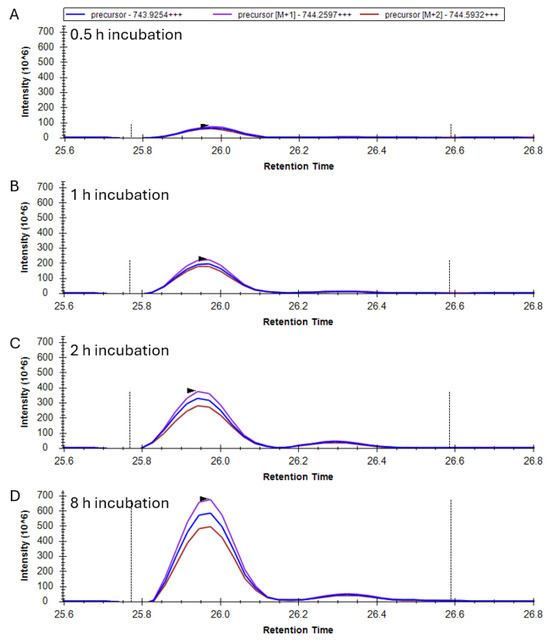 Identification of the 20-YDCDCDCADFHTYLSR-35 peptide with one glutathionylation (+305.1 Da) and one disulfide in γS-crystallin incubated with GSSG. (A) Mass chromatogram of precursor ions after 0.5 h, (B) 1 h, (C) 2 h, and (D) 8 h incubation with GSSG. The mass of the precursor peptide is for the 3+ charge state (+++).