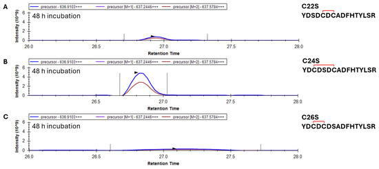 To more closely examine the mechanism of glutathionylation and disulfide formation in γS, cysteine mutants (C22S, C24S, and C26S) were treated with GSSG as above and trypsin-digested, and the oxidation of the 20–35 peptide was assessed. After 48 h incubation with GSSG, the 20–35 peptide containing one disulfide appeared at the greatest intensity in the C24S variant, followed by C22S (Figure 7A,B). The C26S mutant showed no signs of disulfide bonding within the 20–35 peptide (Figure 7C). While a C22–C24 disulfide was observed, albeit in lower abundance, in oxidized WT (Figure 5D), the data on the C26S mutant suggest that such disulfide is highly unfavorable and that the major disulfide formed in WT γS is between C22 and C26. Corroborating the whole-mass data (Figure 3C), C22S was the only species that became doubly glutathionylated at the 20–35 peptide after 48 h incubation with GSSG (Supplementary Figure S2).