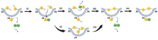 Proposed steps of disulfide bond formation during oxidation of γS. (i) Surface exposed C24 reacts with a GSSG and becomes glutathionylated. (ii) The C26 reacts with glutathionylated C24 and the glutathione is transferred to C26. (iii) A disulfide is introduced between C22 and C26 via attack on a glutathionylated C26 by C22. (iv) In a final step, C24 reacts with another GSSG molecule to produce γS with a single disulfide bond between C22 and C26 and a single glutathionylation at C24. Alternatively, (v) a disulfide can form between C24 and C26, and (vi) subsequent attack by C22 on the disulfide would lead to the same species resulting from Step (iii). Created in BioRender (Academic Version). Lampi, K. (2025) https://BioRender.com/w60l153.