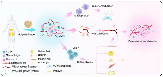 A significant proportion of ad-MVF components consists of adipose-derived stem cells (ADSCs). These cells possess multipotency and active paracrine functions, which have demonstrated considerable potential in tissue repair and regeneration [111]. Therefore, we consider that ADSCs in ad-MVFs act in a similar way, when ad-MVFs are used to promote tissue regeneration. ADSCs share the morphological and immunophenotypic characteristics of mesenchymal stem cells (MSCs) [112]. When administered directly or combined with biofunctional scaffolds, ADSCs adhere, proliferate, and differentiate to replenish damaged tissues [113]. Originating from the mesoderm, ADSCs exhibit typical differentiation capabilities into adipogenic, osteogenic, and chondrogenic lineages. Remarkably, they can also differentiate into non-mesenchymal lineages, such as endothelial, myogenic, and neural lineages [113,114].