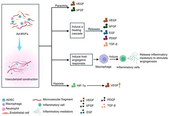 Furthermore, microvascular fragments in ad-MVFs secrete vascular endothelial growth factor (VEGF) and basic fibroblast growth factor (b-FGF), indicating that they serve as a rich source of proangiogenic factors, stimulating angiogenesis in a paracrine manner [82,97]. The rapid formation of vascular networks, the paracrine secretion of cytokines that promote angiogenesis, and the ability to regenerate lymphatic vessels position ad-MVFs as highly efficient agents for early perfusion and vascularization at defect sites.