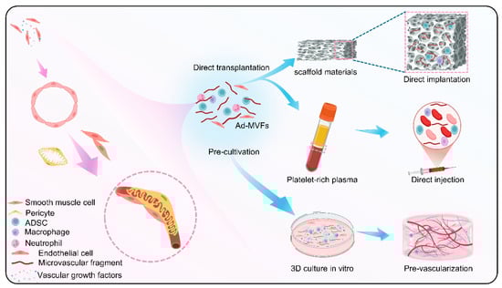 The application of ad-MVFs can be divided into two categories. One is direct transplantation, including the use of scaffold materials for loading and injection in the form of liquid. The other type is pre-cultured in vitro and then implanted into the host tissue (Figure 4).