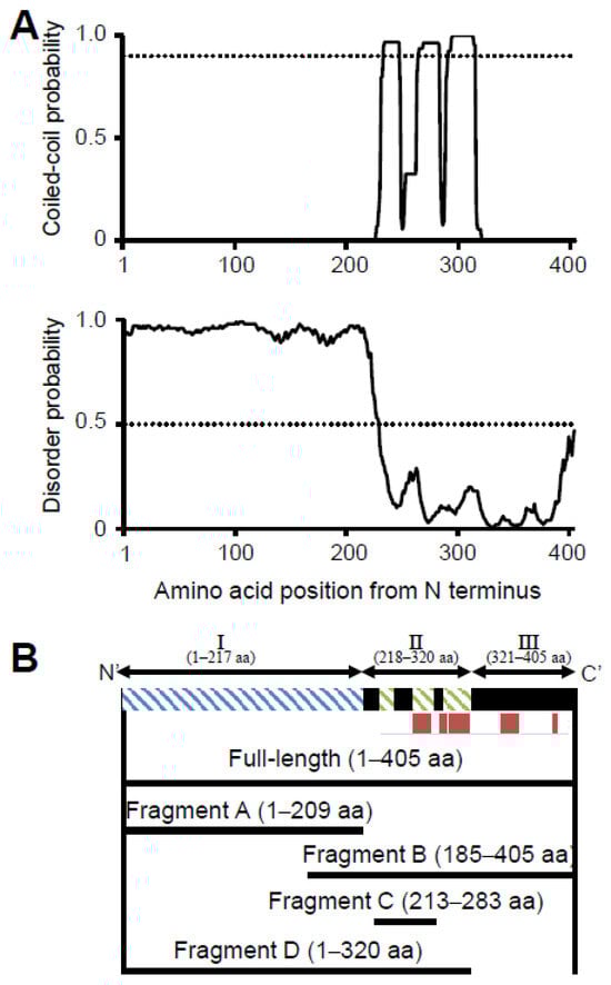 Coiled-coil regions were predicted by COILS (version 2.2.1) [35]. Intrinsically disordered regions were predicted by the DISOPRED3 server (http://bioinf.cs.ucl.ac.uk/psipred/, accessed on 8 March 2025) [36]. α-helical regions were predicted by JPred4 (https://www.compbio.dundee.ac.uk/jpred/, accessed on 8 March 2025) [37]. Sequence similarity was determined using BLAST (https://blast.ncbi.nlm.nih.gov/Blast.cgi, accessed on 8 March 2025) against non-redundant protein sequences in the NCBI database (Figure S1) [38]. The sequences of homologs were aligned using T-COFFEE (https://tcoffee.crg.eu/apps/tcoffee/do:regular, accessed on 8 March 2025) [39].