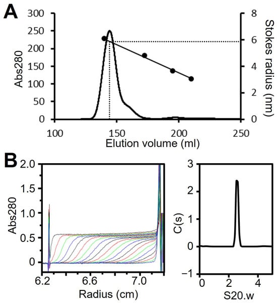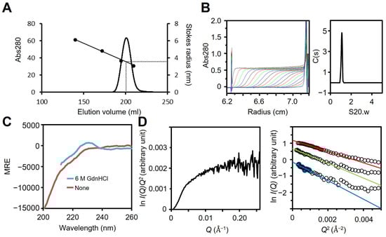 Isolated fragment D at 1 mg/mL was applied to a HiLoad Superdex 200 26/600 (Cytiva) equipped to an AKTA pure 25 (Cytiva). The mobile phase was 150 mM NaCl and 20 mM Tris-HCl (pH 8.0) at 2.5 mL/min at 25 °C. Ferritin (440 kDa, Rs = 6.1 nm), aldolase (158 kDa, Rs = 4.8 nm), conalbumin (75 kDa, Rs = 3.6 nm), and ovalbumin (44 kDa, Rs = 3.1 nm) were used as standards [41,42].