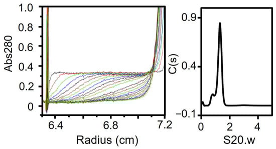 Next, we focused on fragment C. We treated P65 with trypsin, isolated fragment C and confirmed by PMF (Figures S2B,C and S4). We characterized the oligomerization state of fragment C using ultracentrifugation. The sedimentation coefficient distribution profile of fragment C showed a single peak with a sedimentation constant of 1.3 (Figure 5, Table 1). The derived molecular mass of the peak was 25.6 kDa, which agreed with the theoretical mass of a trimer of fragment C (25,893 Da).