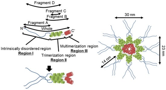 Figure 7 shows the structure of the molecule and its complex based on the experimental results. The complex observed by EM was composed of a central globule with axes of 30 and 23 nm and four to six filaments approximately 14 nm in length (Figure 2D,E). Based on the structural prediction from the amino acid sequence, P65 can be divided into three regions: region Ι (the N-terminal intrinsically disordered region composed of residues 1–217), region ΙΙ (the coiled-coil region composed of residues 218–320), and region ΙΙΙ (the C-terminal region composed of residues 321–405) (Figure 1B). The EM results showed that the filamentous part of refolded P65 disappeared after digestion with the endopeptidase, Asp N (Figure 4). The digested region was assigned to residues 1–185 by PMF, suggesting that the filamentous and central parts are composed of residues 1–185 and 186–405, respectively. Analysis of the amino acid sequence suggested that region I is intrinsically disordered (Figure 1A), which was supported by the observation that 6 M GdnHCl did not significantly alter the CD spectrum of fragment A (Figure 3C). This conclusion was also supported by the analytical ultracentrifugation and the SAXS analyses (Figure 3B,D).