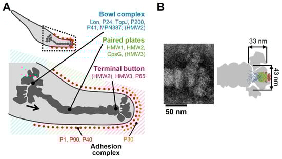 Assignment of P65 onto the image of attachment organelle. (A) The whole cell image is shown in the upper panel. The region in dotted lines is magnified in the lower panel, showing the localization of component proteins. The suggested force transmission is indicated by a black arrow. This figure was modified from [21]. (B) Schematic representation of P65 on a composite negative staining EM image of the isolated core (modified from Figure 2 of [21]). The P65 is shown as a side view of the bottom image in Figure 7.