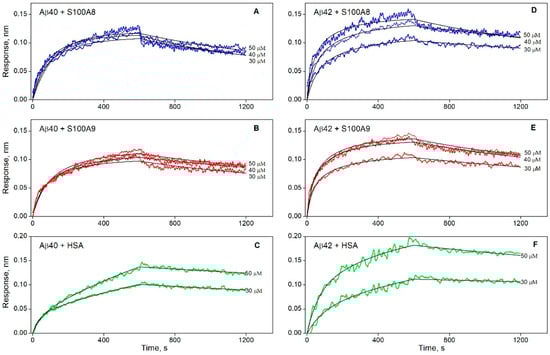 Since HSA serves as a natural depot of Aβ [28,29], an intriguing question is whether S100A8/S100A9 can affect Aβ binding to HSA. The BLI sensograms for HSA (30–50 µM) interaction with monomeric Aβ40/Aβ42 immobilized on a BLI sensor are described by the heterogeneous ligand model (2) (Figure 1C,F). The resulting KD values (Table 2) are in agreement with our previous surface plasmon resonance (SPR) estimates [30,59].