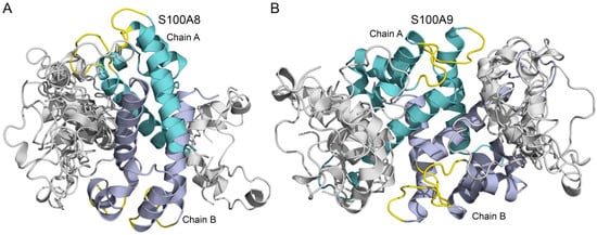 Overlay of the 10 representative models of S100A8–Aβ40 (A) and S100A9–Aβ40 (B) complexes calculated using the ClusPro docking server [68]. Aβ40 monomers are shown in grey. Chains A and B of S100A8/S100A9 dimers are shown in cyan and dark grey, respectively; their Ca2+-binding loops are highlighted in yellow.