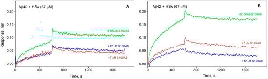 Kinetics of HSA (67 µM) interaction with monomeric Aβ40 (A) or Aβ42 (B) immobilized on a BLI sensor in the absence (green) or presence of S100A8 (12 µM, blue) or S100A9 (7 µM, red) at 25 °C, monitored using BLI (20 mM Tris-HCl, 140 mM NaCl, 4.9 mM KCl, 2.5 mM CaCl2, 1 mM MgCl2, pH 7.4).