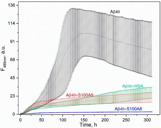The human Aβ40 samples were pretreated as described in ref. [61] with some modifications. Aβ40 sample was dissolved in 5 mM NaOH at pH 11.8 (0.5 mg/mL) and then rocked gently for 72 h at 4 °C. ThT fluorescence emission was measured mainly as described in ref. [61]. Aβ40 at 20 µM in 25 mM Tris-HCl, 140 mM NaCl, 4.9 mM KCl, 2.5 mM CaCl2, 1 mM MgCl2, and pH 7.4 buffer with 0.05% NaN3 was incubated with 10 µM ThT in the absence/presence of 5 µM HSA, 4 µM S100A8 or 4 µM S100A9 at 30 °C. The ThT fluorescence intensity (λem = 485 nm, λexc = 440 nm) was recorded every 30 min for 266 h using a BioTek Synergy H1 multimode microplate reader (Agilent Technologies, Inc., Santa Clara, CA, USA) with orbital shaking prior to each measurement. Each measurement was performed in 3–4 repetitions. The control kinetic curves (for the wells without Aβ40) were subtracted from the corresponding kinetic curves of the experimental samples. The control kinetic curves are shown in the Supplementary Materials (Figure S4). Data are presented as the mean ± standard deviation. The effect of S100A8 (4 µM), S100A9 (4 µM), and HSA (5 µM) on ThT fluorescence in samples of mature Aβ fibrils was additionally monitored. The corresponding kinetic curves are given in the Supplementary Materials (Figures S7 and S8).