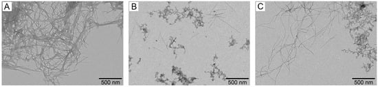 Negative staining TEM images of the 20 μM Aβ40 fibers grown in the course of the ThT fluorescence assay (A) and in the presence of 4 μM S100A8 (B) or 4 μM S100A9 (C). The scale bars represent 500 nm.