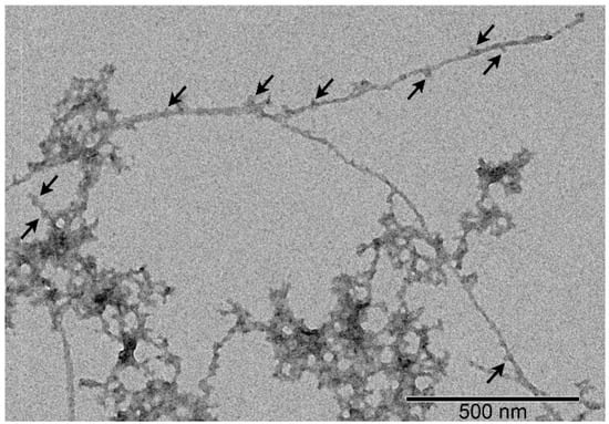 Negative staining TEM image of the complex between Aβ40 (20 μM) fibers and S100A9 (4 μM). The scale bar represents 500 nm. The arrows indicate the probable sites of S100A9 adhesion to Aβ40 fibrils.