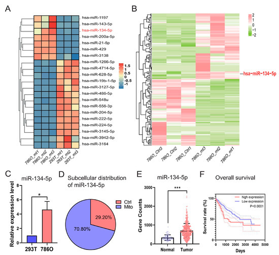 Among these pdmt-miRNAs, we observed that miR-134-5p was uniquely upregulated in the mitochondria of 786O cells when compared to either the mitochondria of 293T cells or the control components within 786O cell (Figure 2A,B and Tables S4 and S5), indicating its potential roles in regulating ccRCC progression. To further validate its dysregulation and subcellular distribution, we performed RT-qPCR after fractionation assays in both 293T and 786O cells. Our results confirmed that miR-134-5p was significantly upregulated in the mitochondria of 786O cells, regardless of whether it was compared to 293T cells or the control components within 786O cells (Figure 2C,D). Additionally, by validating its expression in TCGA-retrieved ccRCC patients, we found that miR-134-5p was dramatically and broadly upregulated in tumor samples (Figure 2E). Kaplan–Meier (KM) survival analyses further suggested that the upregulation of miR-134-5p was closely associated with poor survival outcomes in ccRCC patients (Figure 2F), suggesting its oncogenic roles in ccRCC.