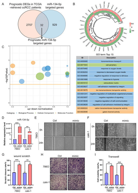 Next, to investigate the role of these prognostic miR-134-5p-targeted genes, we conducted functional enrichment analysis. Our analysis revealed multiple biological processes, including “transmembrane transport”, “response to hypoxia”, and “cell adhesion” (Figure 3C and Table S10). The gene ontology results were again enriched in the biological processes of metabolism and transmembrane transport-related terms, suggesting that miR-134-5p might play an oncogenic role by regulating these functions and ultimately affecting cell adhesion-related functions. To verify whether miR-134-5p regulates ccRCC cell migration, we overexpressed miR-134-5p mimics. The expression of miR-134-5p was significantly increased compared to the control group in both 786O and Caki-1 cell lines (Figure 3D). Subsequently, both wound scratch and Transwell assays demonstrated that the ratio of cell mobility with miR-134-5p overexpression was remarkably higher than that of the control in both 786O and Caki-1 cell lines (Figure 3E–I). These results suggest that miR-134-5p can enhance ccRCC cell migration capability.