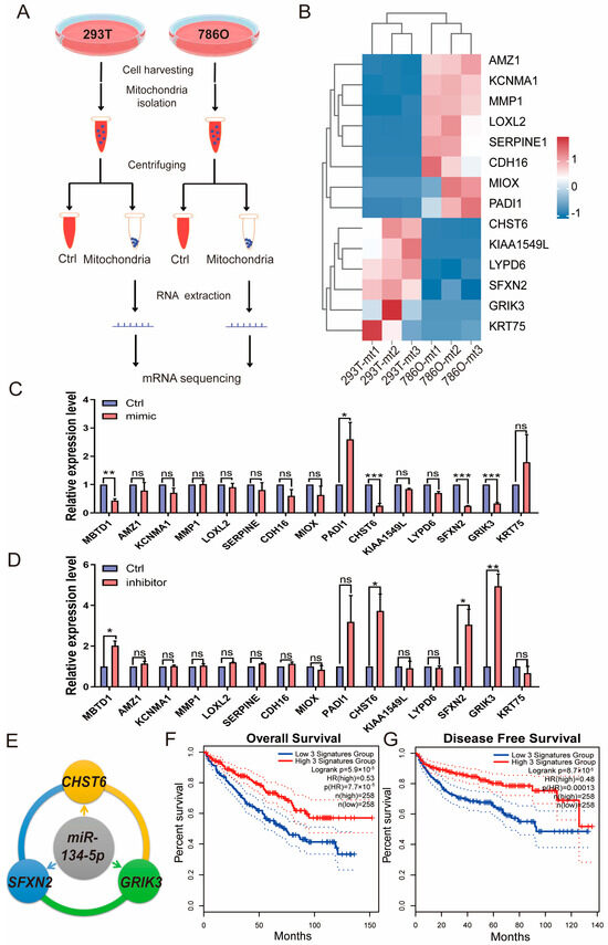 miR-134-5p inhibits the mRNA expression of CHST6, SFXN2, and GRIK3. (A) A schematic view of experimental outline for identifying the mitochondrial mRNAs in the indicated 293T and 786O cells. (B) Heatmap shows the expression of mitochondrial mRNAs in the indicated 293T and 786O cells (n = 3). (C) Relative expression of the indicated mitochondrial mRNAs in the present of control or miR-134-5p mimic 786O cells (n = 3). (D) Relative expression of the indicated mitochondrial mRNAs in the present of control or miR-134-5p inhibitor 786O cells (n = 3). (E) A schematic view of miR-134-5p regulatory networks. (F,G) Overall (F) or Disease free (G) survival analysis of miR-134-5p-regulated gene signature, including CHST6, SFXN2, and GRIK3, in the TCGA-retrieved ccRCC patients (n (low) = 258, n (high) = 258, HR(OS) = 0.53, HR(DFS) = 0.48). Data are shown as means ± SEM. *** p < 0.001, ** p < 0.01, * p < 0.05, and ns > 0.05.