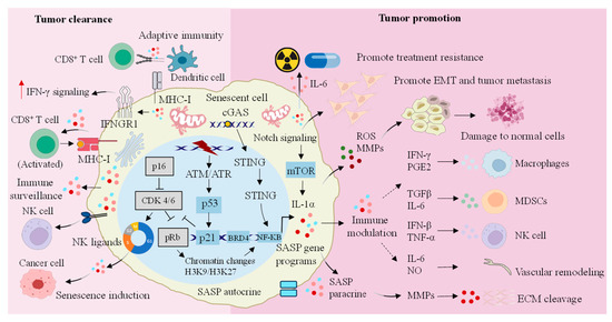 Cancer cells gain the ability to proliferate uncontrollably due to various carcinogenic signals. Mutations in key genes or genomic instability due to epigenetic changes drive cell carcinogenesis and ongoing proliferation, while metabolic reprogramming allows cancer cells to obtain energy from external sources. Interactions between carcinogenic signaling pathways and metabolic reprogramming can lead to TME remodeling and disrupt immune cell functions, promoting immune escape [153]. Thus, from the perspective of cancer cell development, excessive DNA damage or inadequate repair due to internal and external factors leads to gene mutations that affect protein homeostasis through transcription and translation. These mutations alter intracellular signaling pathways, metabolic pathways, and immune activation by disrupting biological functions, resulting in complex signaling networks with both positive and negative feedback mechanisms in cancer cells. Notably, there are similarities and antagonistic features between cancer characteristics and those of cell senescence. As a result, research into treating cancer by inducing cell senescence is gaining popularity. However, in clinical practice, SASP production is a key feature of both normal and cancer cells post-senescence, with SASP exerting dual regulatory effects on the TME, immune cells, and tissue homeostasis. The impact of SASP on cancer cells depends significantly on the environment and cell type, and varies at different stages of cancer progression [154]. In the early stages of carcinogenesis, SASP generally inhibits tumors, while in advanced stages, SASP tends to promote tumor growth [113]. Therefore, treatments designed to induce cancer cell senescence need to account for the varying degrees and stages of cancer progression.
