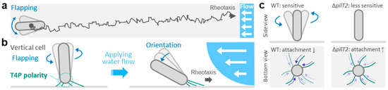 The T4P machinery is typically localized at cell poles in rod-shaped bacteria, often with biased T4P activity at one pole [73,74,75]. An exception to this pattern is observed in Thermosynechococcus, which regulates asymmetric T4P distribution within a single cell pole [61]. Recent studies have reported that T. thermophilus exhibits positive rheotaxis, a directional movement against water flow [13] (Figure 2a). This T4P-dependent rheotaxis has also been reported in Pseudomonas and Xylella [60,76]. Therefore, the question should be asked of what the molecular mechanism involved in sensing the direction of water flow during rheotaxis is.